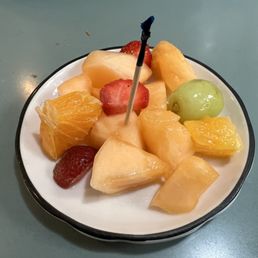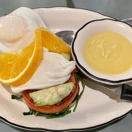 2 poached eggs on an English muffin with sauteed spinach, avocado, grilled tomatoes and fruit salad.